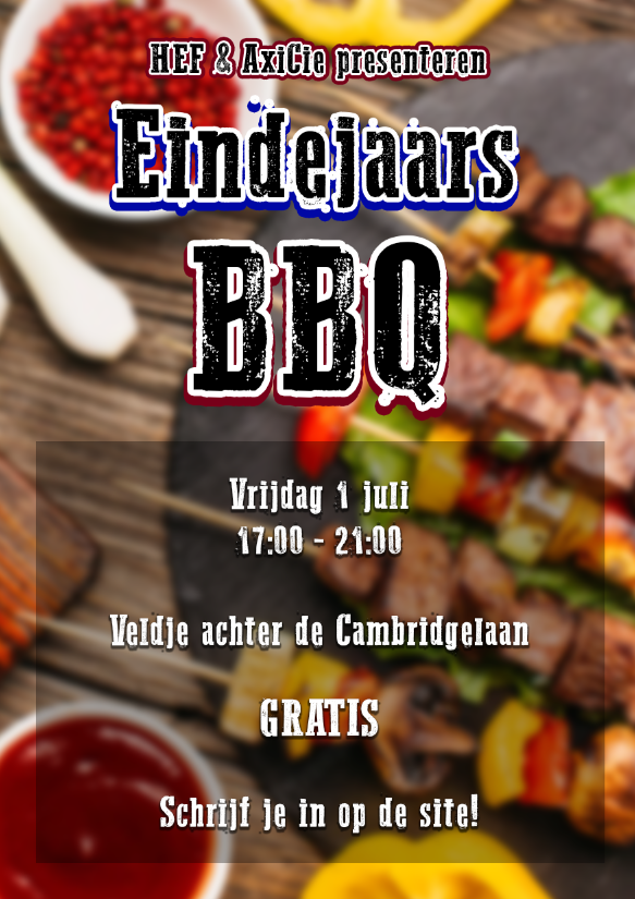 Het is jammer genoeg alweer het einde van het lustrumjaar :( Maar niet getreurd, we gaan dit prachtige 50-jarige bestaan van A-Eskwadraat afronden met een fantastische eindejaars BBQ! De tentamens zijn klaar, opdrachten ingeleverd, de zomer kan beginnen! Geen reden dus om niet te komen, dus schrijf je snel in!