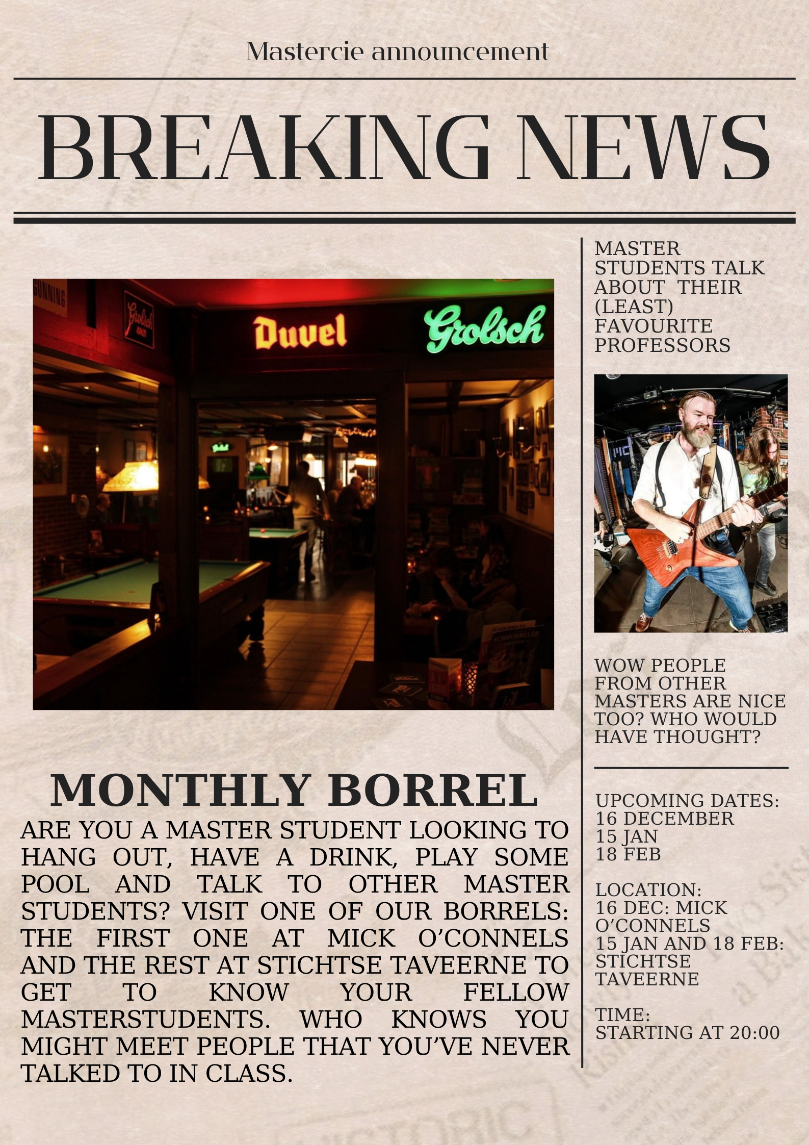 De MasterCie borrels zijn terug van weggeweest! Vanaf 20u kun je bij Mick borrelen en spelletjes spelen en je mede masterstudenten beter leren kennen