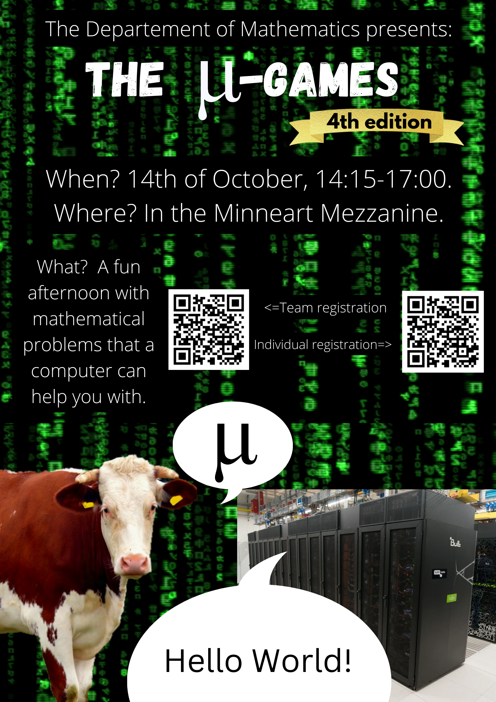 The fourth edition of the μ-Games (Mathematics Utrecht) will take place on Friday 14 October, 14.15-17.00, in the Minnaert Mezzanine. This will be a friendly programming contest focused on mathematical thinking. For all problems you must first think mathematically and then write a short program to calculate the answer. The exercise sheet will also include problems aimed at bachelor's students. You can sign up in a team of 3 or 4 students, or individually. In the latter case, we will match you with a few fellow students. During the competition you can program in C#, Java and Python. The event will take place on site, but can also be joined online if you cannot make it on site. If you have questions, you can reach us at: [email protected]. Sign up as a team, or as an individual. Hope to see many of you there!