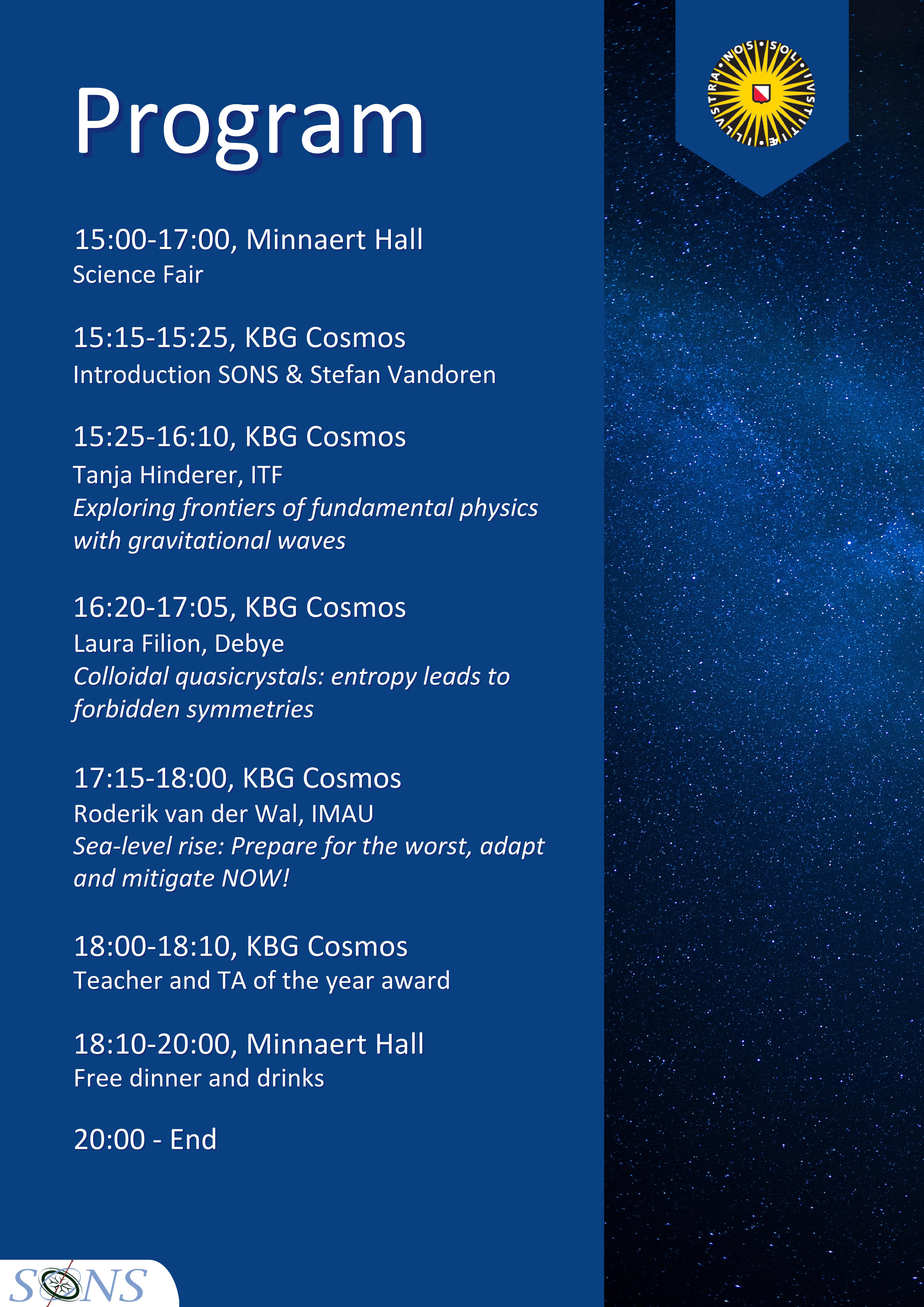 De departementsdag is op 10 mei en vindt plaats in de Minnaert Hal en KBG Cosmos. Het begint om 15:00 eb eindigt rond 20:00. Zie de poster voor het volledige programma. Om het buffet en borrel te bezoeken moet je ook de colleges bijwonen.
