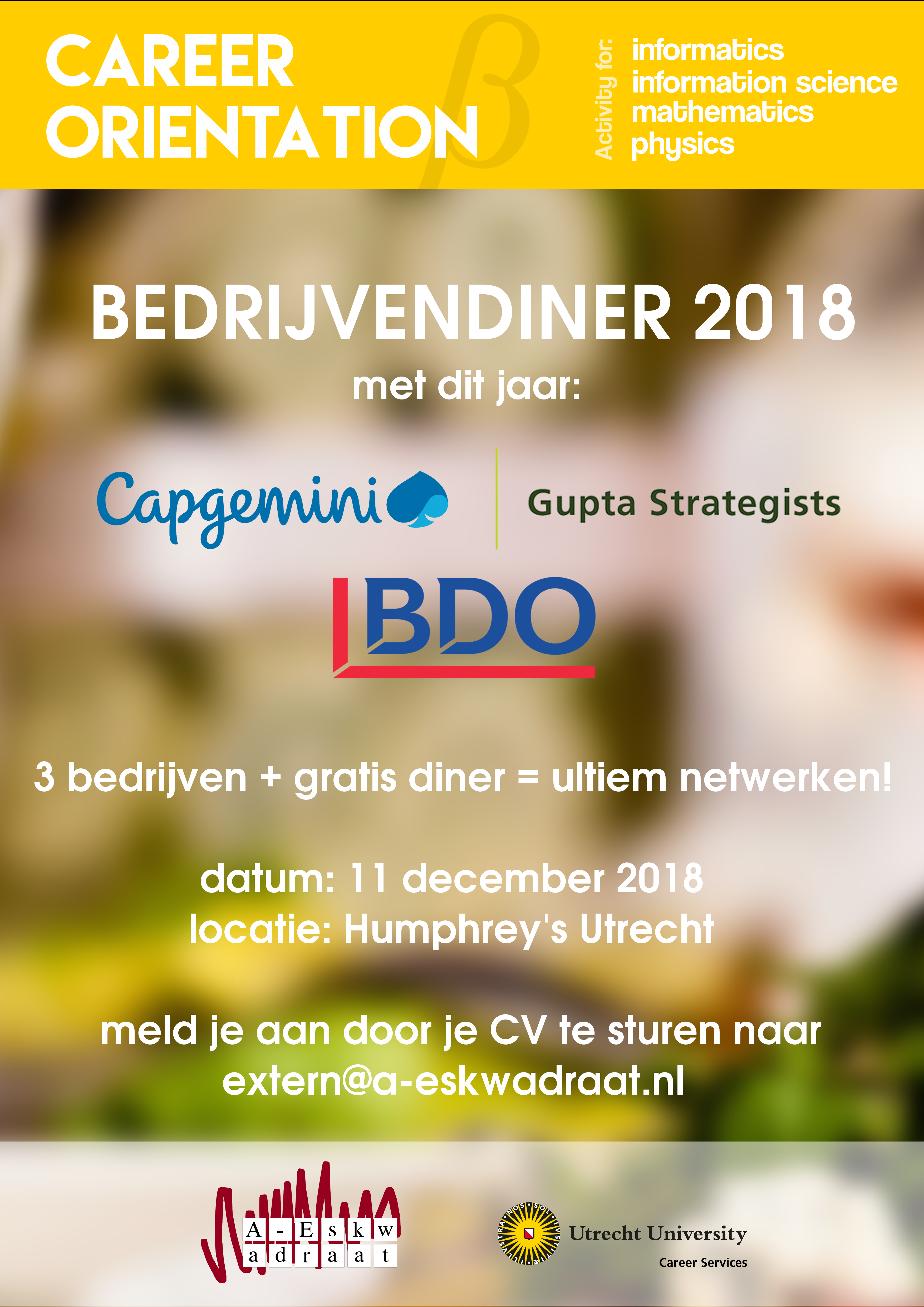 Het Bedrijvendiner is een van de grootste arbeidsmarktorientatie-evenementen van het jaar. Wij nodigen 21 studenten en 3 bedrijven uit om elkaar te ontmoeten onder het genot van een uitgebreid diner in een restaurant midden in Utrecht, geheel verzorgd door ons! Per gang zul je met 2 werknemers praten van een van de bezoekende bedrijven en krijg je een informele doch informatieve blik in hoe het is om bij dit bedrijf te werken.