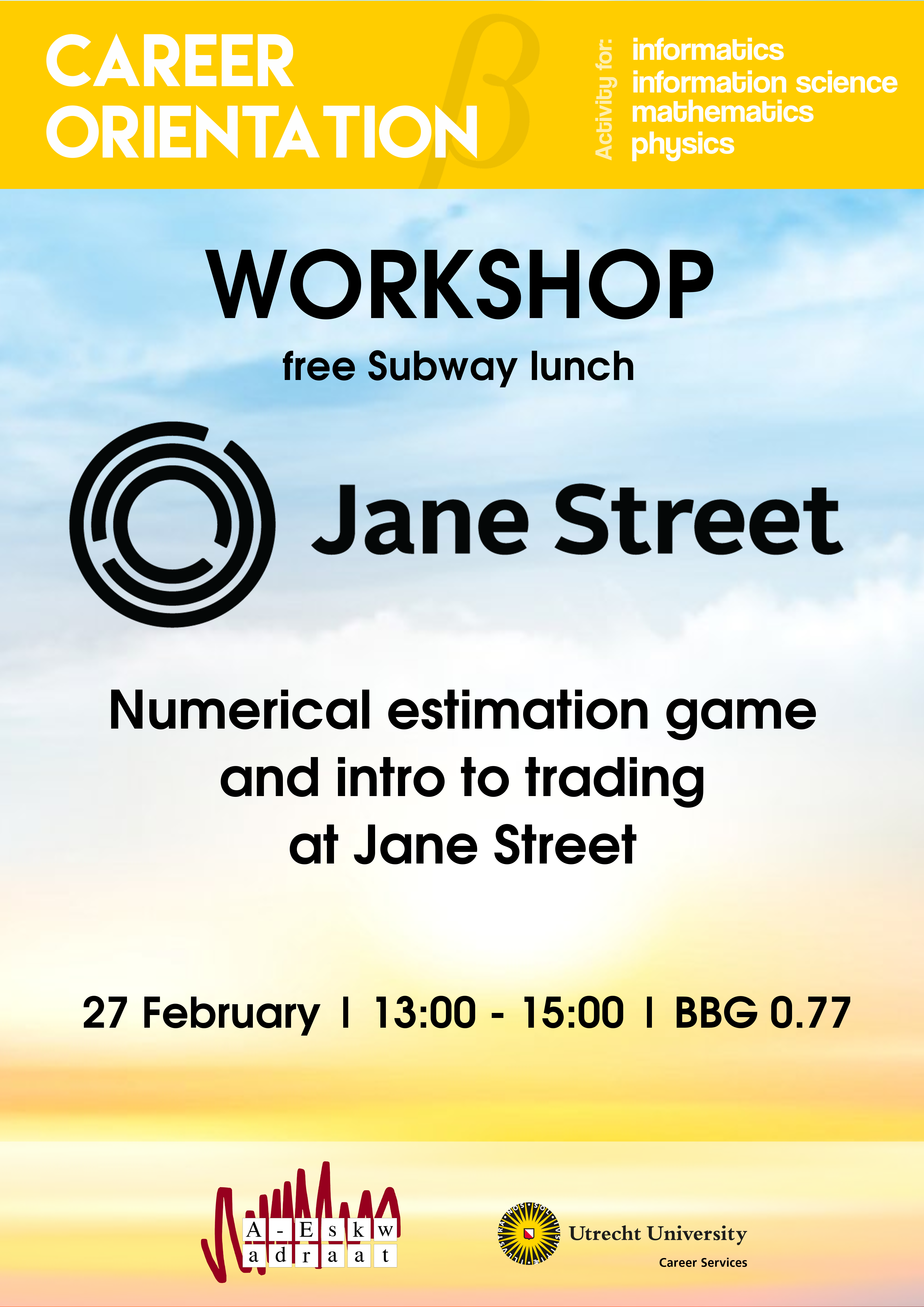 Jane Street will give you a brief introduction to what they do and answer any questions you might have, followed by a competition that will challenge you to estimate numerical answers to math, science and general knowledge questions.