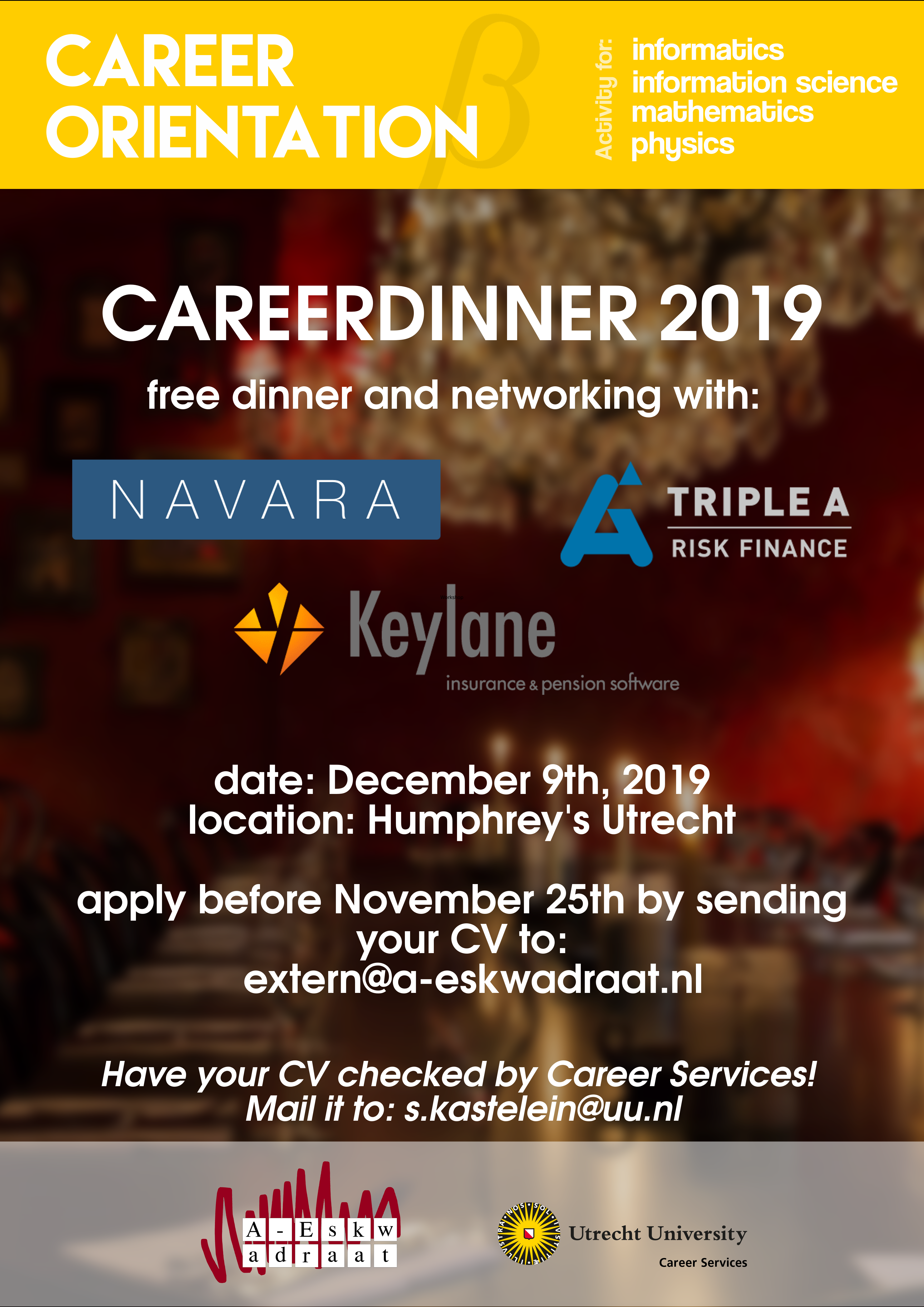 If you would like to come to the awesome career dinner on the 9th of december you'll have to apply by sending your resume to [email protected]