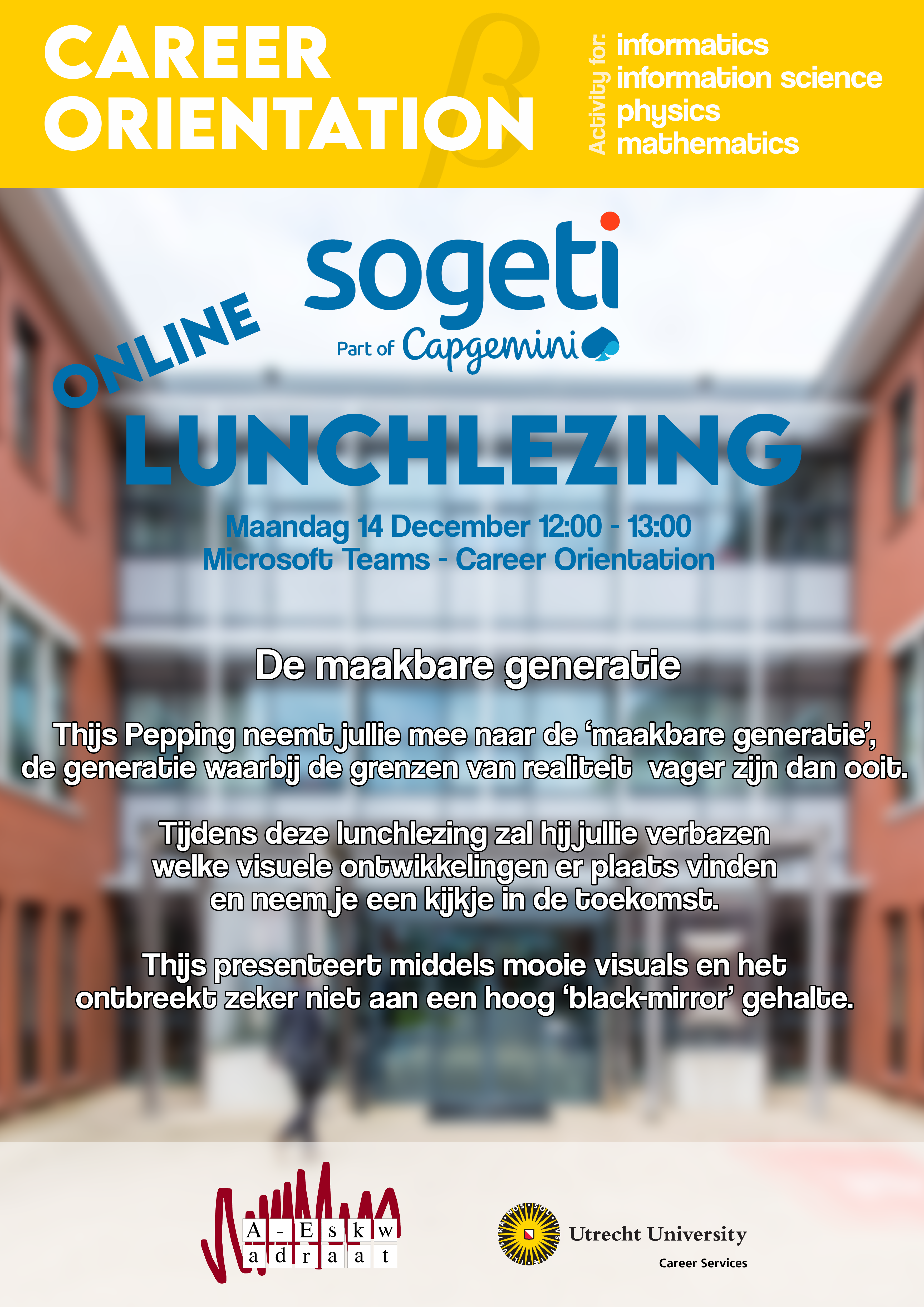 Thijs Pepping neemt jullie mee naar de ‘maakbare generatie’, de generatie waarbij de grenzen van realiteit vager zijn dan ooit. Tijdens deze lunchlezing zal hij jullie verbazen welke visuele ontwikkelingen er plaats vinden en neem je een kijkje in de toekomst. Thijs presenteert middels mooie visuals en het ontbreekt zeker niet aan een hoog ‘black-mirror’ gehalte. Mocht je een voorproefje willen? Kijk dan op zijn Youtubekanaal https://www.youtube.com/user/TPepping/videos. Tot dan!