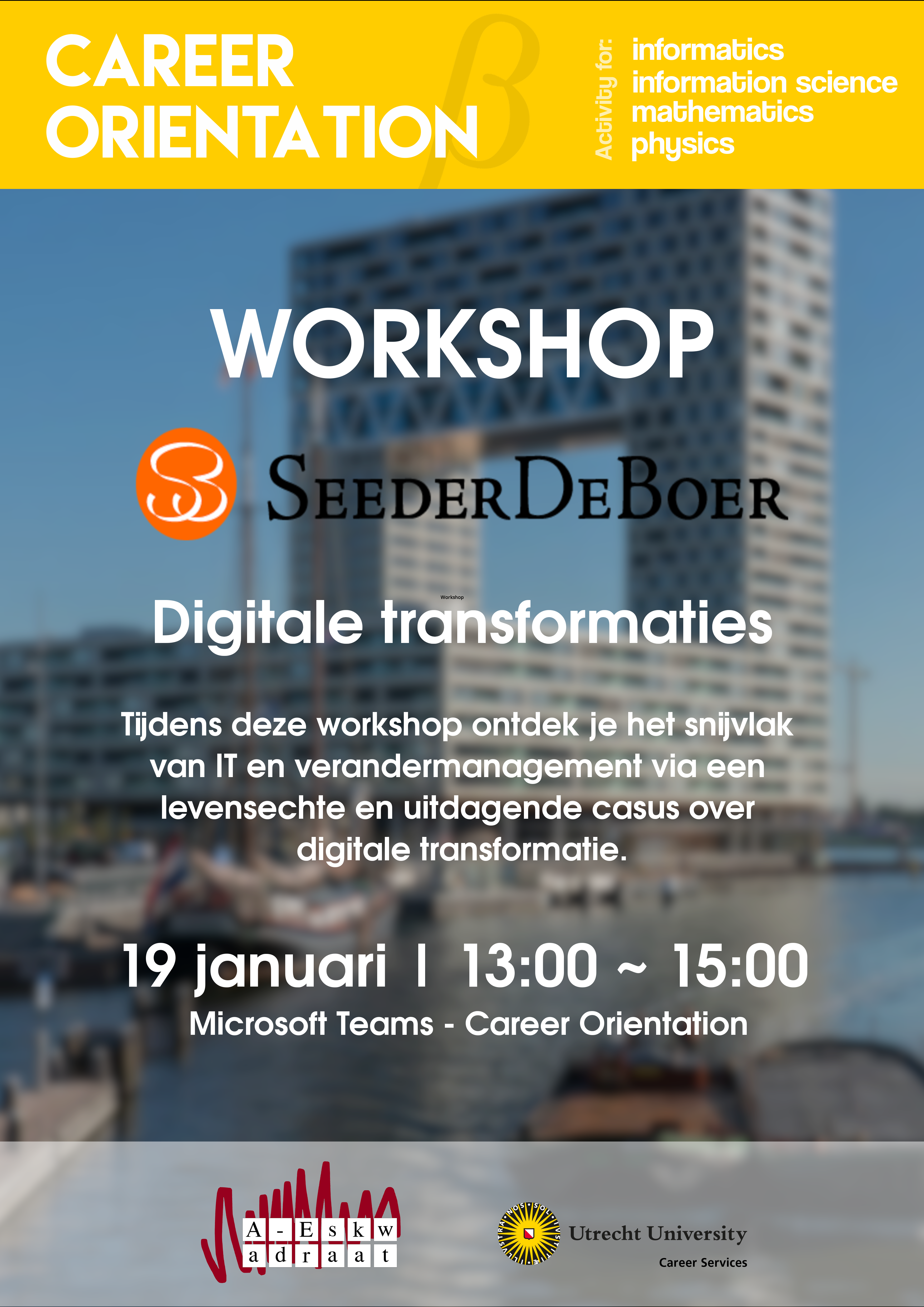 Wij zijn SeederDeBoer: een toonaangevend organisatieadviesbureau als het gaat om het vormgeven van business-, digitale en procestransformaties. Tijdens onze workshop ontdek jij het snijvlak van IT en verandermanagement. Via een levensechte en uitdagende casus over digitale transformaties kruip jij in de huid van één van onze consultants. Jouw uitdaging is om niet alleen technische aspecten, maar ook op organisatie- en op menselijk niveau succesvol te veranderen.