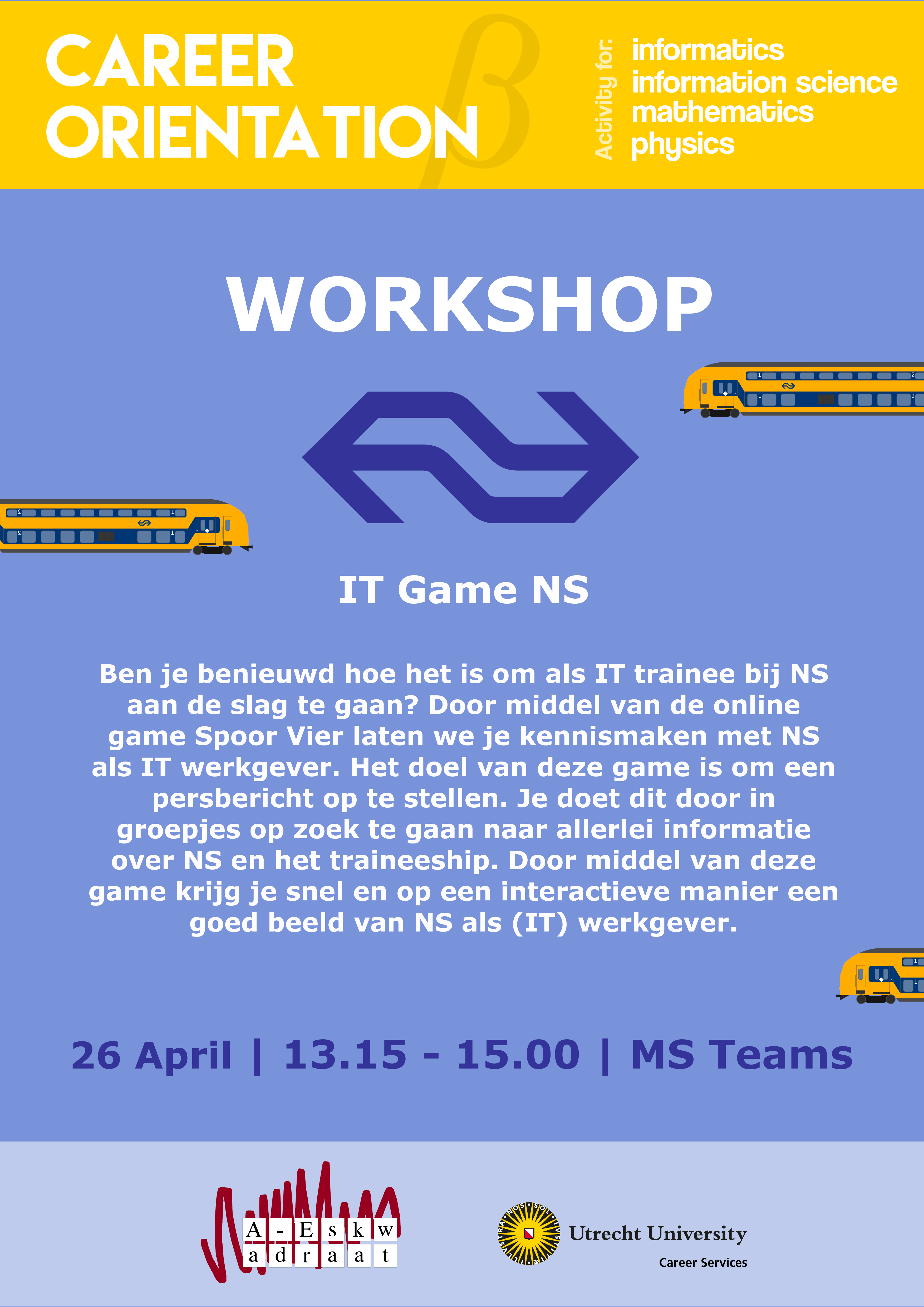Ben je benieuwd hoe het is om als IT trainee bij NS aan de slag te gaan? Door middel van de online game Spoor Vier laten we je op 26 april kennismaken met NS als IT werkgever. Het doel van deze game is om een persbericht op te stellen. Je doet dit door in groepjes op zoek te gaan naar allerlei informatie over NS en het traineeship. Door middel van deze game krijg je snel en op een interactieve manier een goed beeld van NS als (IT) werkgever.