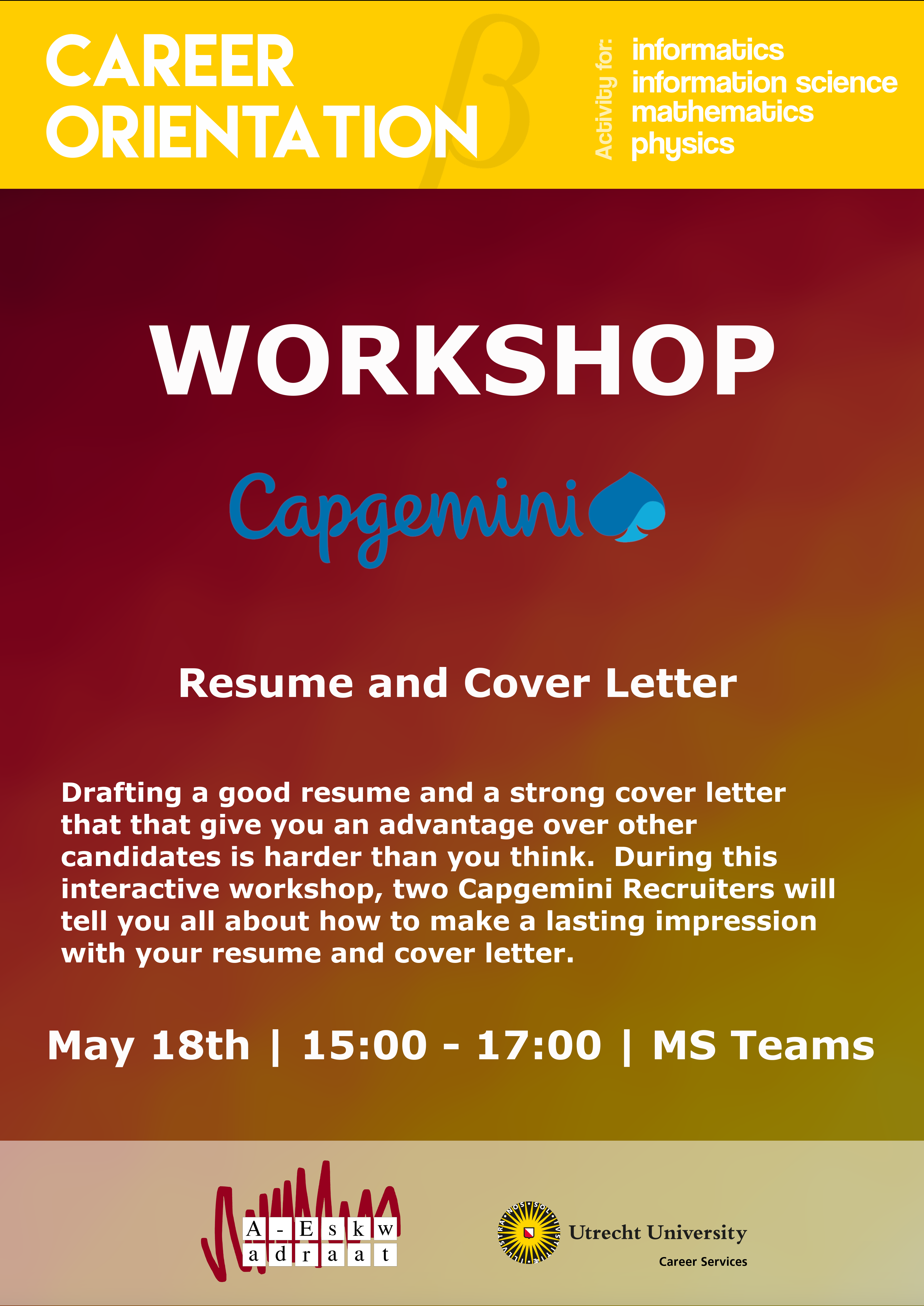 Drafting a good resume and a strong cover letter that that give you an advantage over other candidates is harder than you think. Employers receive hundreds of applications each month, which means they don't have much time to look at all the resumes and cover letters. During this interactive workshop, two Capgemini Recruiters will tell you all about how to make a lasting impression with your resume and cover letter. We also tell you everything about digital applications. So, do you want to stand out with your application? Sign up now for the resume and motivation training of Capgemini! Link to the channel: Workshop Resume and Cover Letter