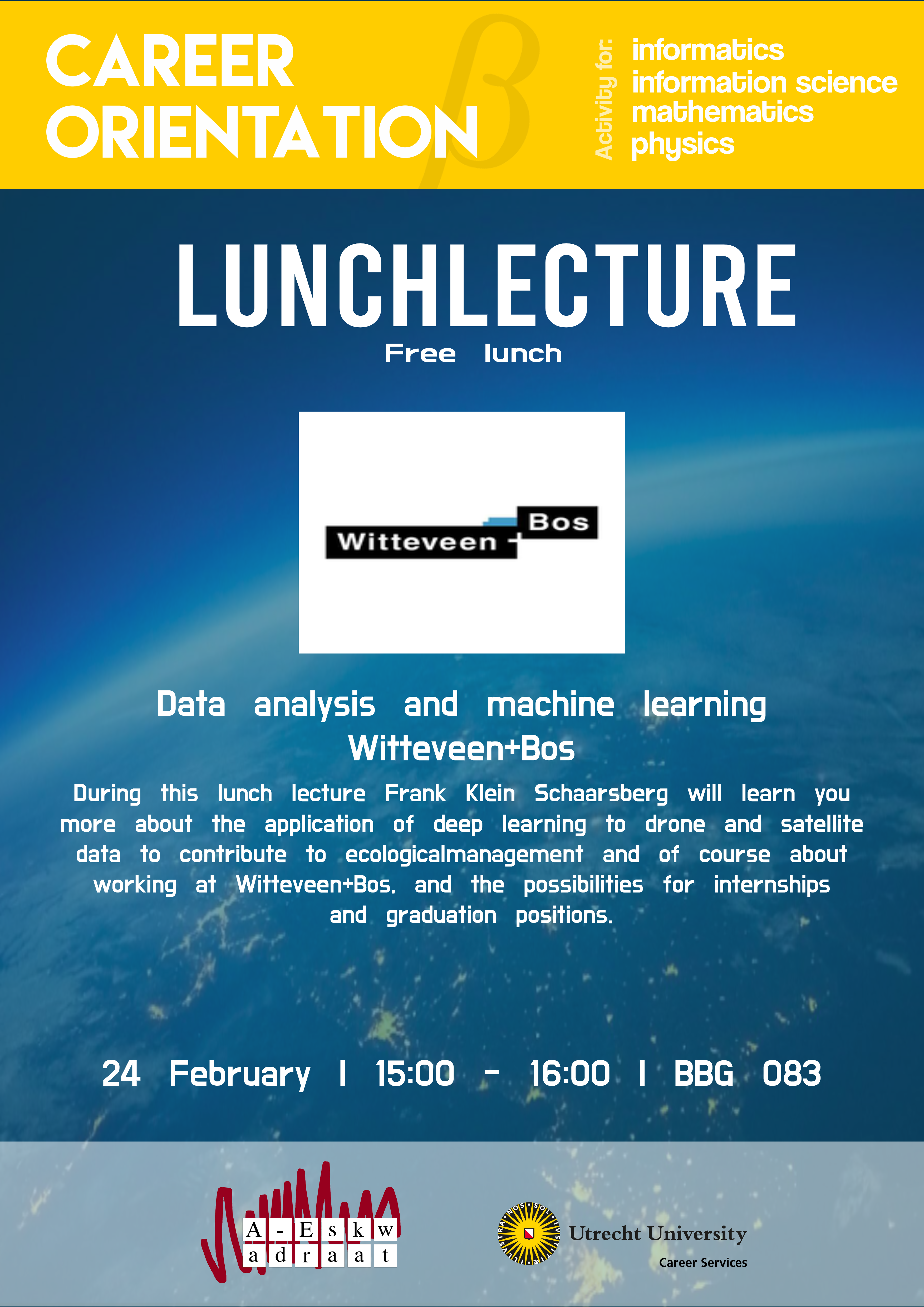 During this lunch lecture Frank Klein Schaarsberg (graduated just over 2.5 years ago as a applied mathematician) will take you into the world of data analysis within the projects of Witteveen+Bos. Learn more about the application of deep learning to drone and satellite data to contribute to ecological management; analyzing the relationship between driving speed and vibrations induced by freight trains using machine learning; and of course about working at Witteveen+Bos, and the possibilities for internships and graduation positions.