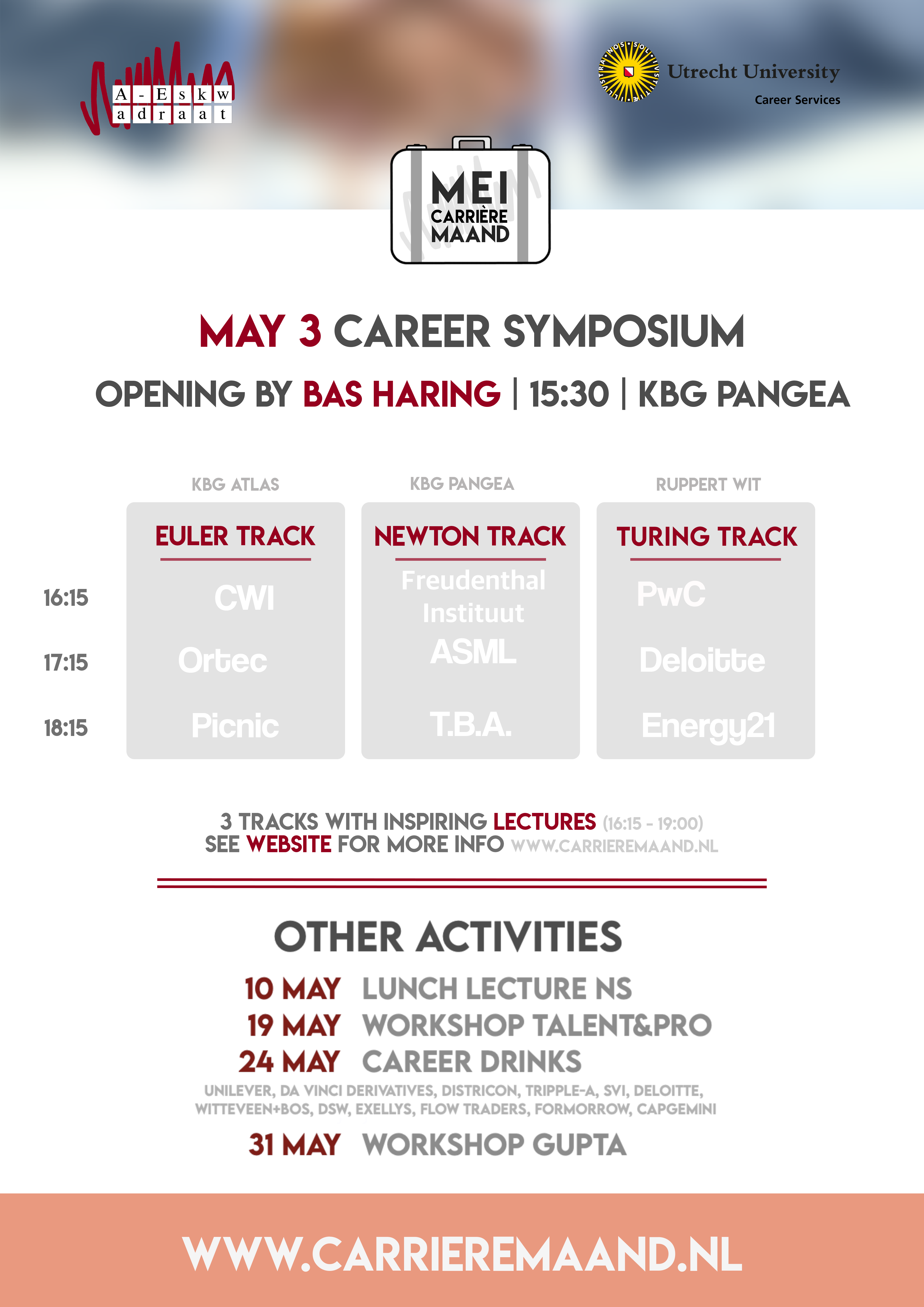 A symposium focussed on career orrientation! There will be parallel sessions focused on Information/Computing Science (Turing Track), Physics (Newton Track) and Mathematics (Euler Track). Everybody is welcome at every session.