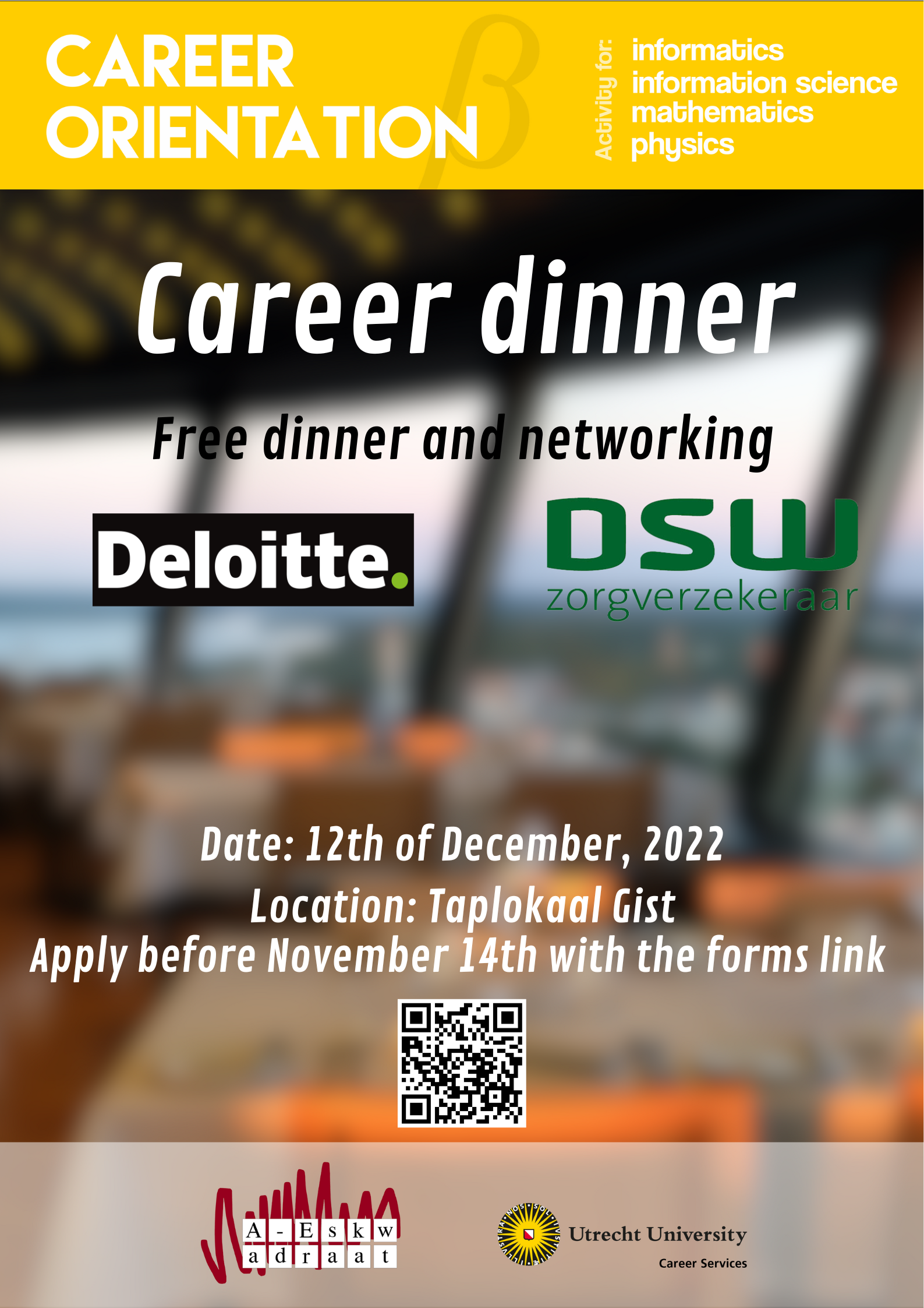 Free dining and networking with Deloitte, DSW and another company to be announced. We will eat at Taplokaal Gist, and you will have a chance to meet these companies during the evening. Are you interested? Sign up using your CV via the forms: https://forms.gle/hBLGhzeVtU4t68DN9.