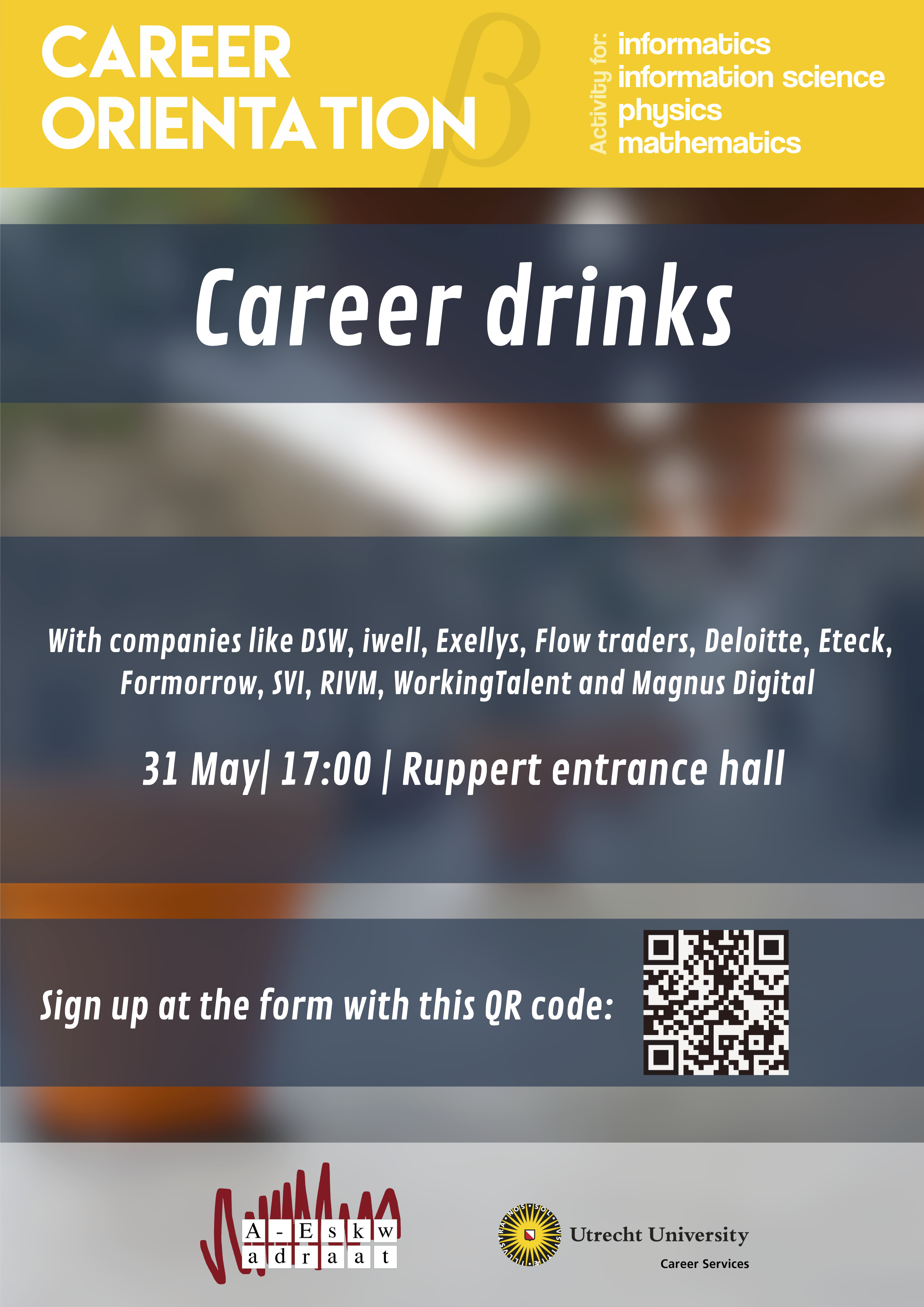 On the 31st of may, there will be career drinks again! There will be a bunch of interesting companies with which you can talk informally and start networking! Save the date!