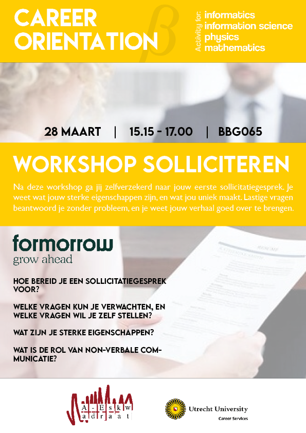 Dinsdag 28 maart zal ForMorrow een workshop geven over solliciteren. Solliciteren hoeft namelijk niet spannend te zijn! Door deze workshop leer je hoe je met de juiste voorbereidingen een goede eerste indruk achterlaat.