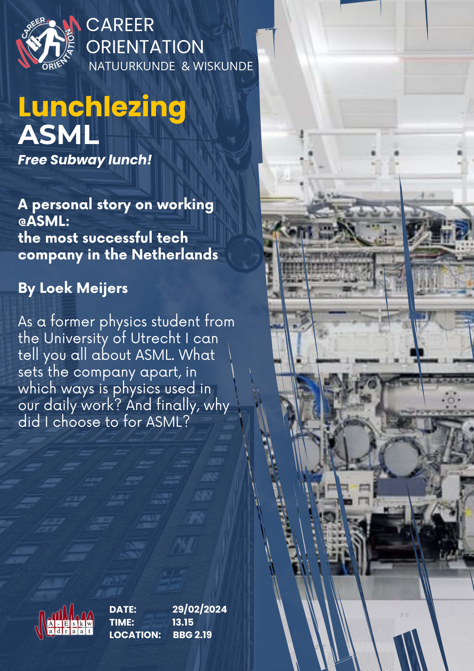 Join us for an insightful lunch lecture organized by Study Association A-Eskwadraat, featuring ASML, the most successful tech company in the Netherlands.