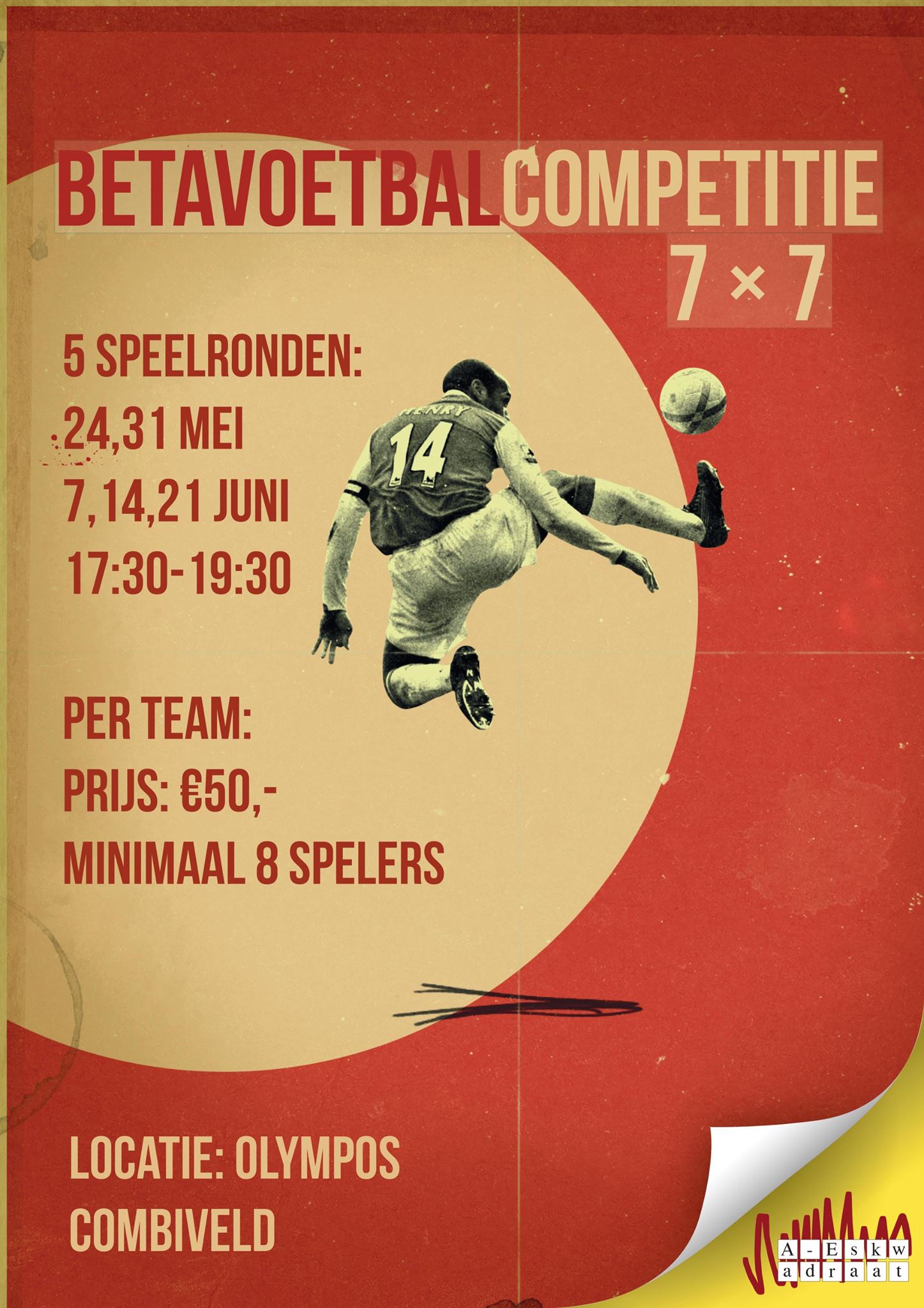 The Betafootballcompetition 2017 is almost here! For five weeks, teams from the different science-faculty student associations will go up against each other in a heated football match! The tournament will take place over five wednesday evenings, and the matches will be played on a half of a field. A team has to have at least 8 players. The finale is on the 21th of June. Sign-ups are open right now. You can buy a team-ticket for 50 euros