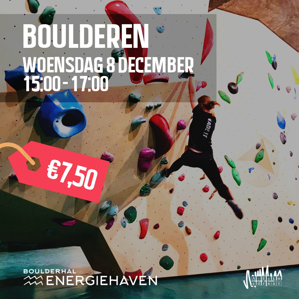 Kom gezellig van 15:00-17:00 boulderen bij boulderhal Energiehaven, voor slechts €7,15 (€7,50 inclusief ideal kosten). Je hebt sportkleding nodig. Klimschoentjes kan je daar los huren voor €3,50, maar het mag ook met gewone (en schone) sportschoenen. Koop hier je kaartje. (Koop er max 1 per persoon)