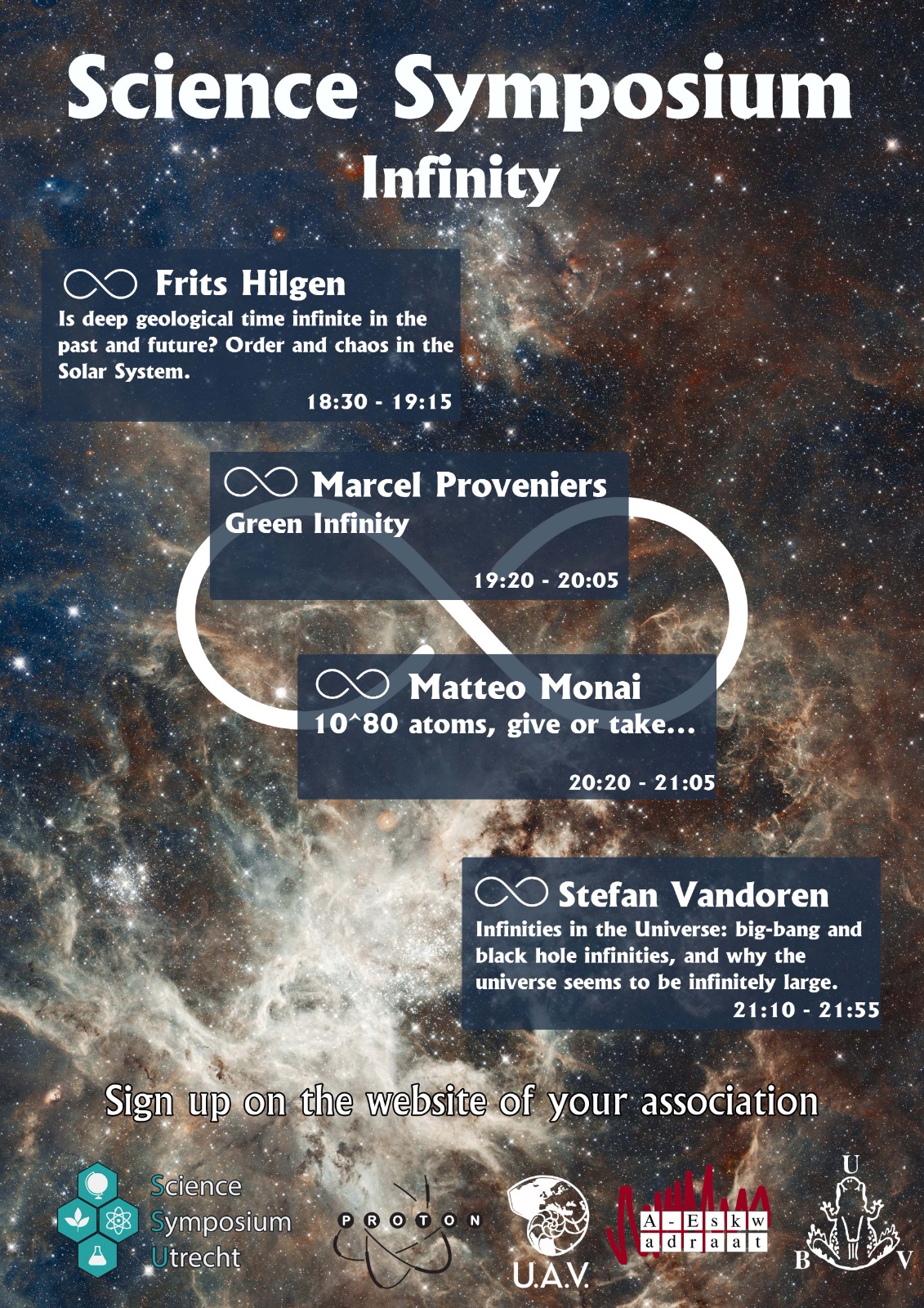 Jaja mensen, 28 Febuari zal het weer gebeuren, hét Science Symposium Utrecht, georganiseerd door U.A.V., Proton, U.B.V. en A–Eskwadraat. Omdat we dit met meerdere verenigingen organiseren beloofd het weer een waar spektakel te worden. Er zullen sprekers zijn van elk van de vier studies en verenigingen (Aardwetenschappen, Scheikunde, Biologie en Wis- en Natuurkunde), en dit jaar is het thema Infinity. Gezien het feit dat je als wis- of natuurkundige bijna meer gewend bent aan het zien van ∞ dan van gewone getallen (in het bijzonder uiteraard het getal 78) is dit natuurlijk een mega interessant onderwerp. Sla de datum alvast op in je agenda, want dit symposium wil je zeker niet missen!