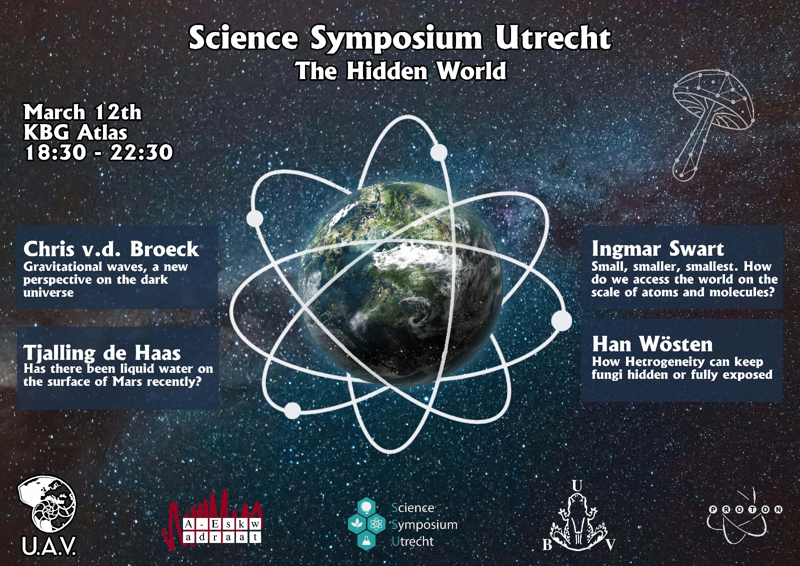 On Wednesday, March 12, the Science Symposium Utrecht will take place once again! Starting at 18:30, four speakers from four different disciplines will tell you all about the theme The Hidden World. On behalf of A–Eskwadraat, prof. dr. Chris van den Broeck shall talk about gravitational waves and how it can give a new perespective on our dark universe. You can find the full program on the poster.