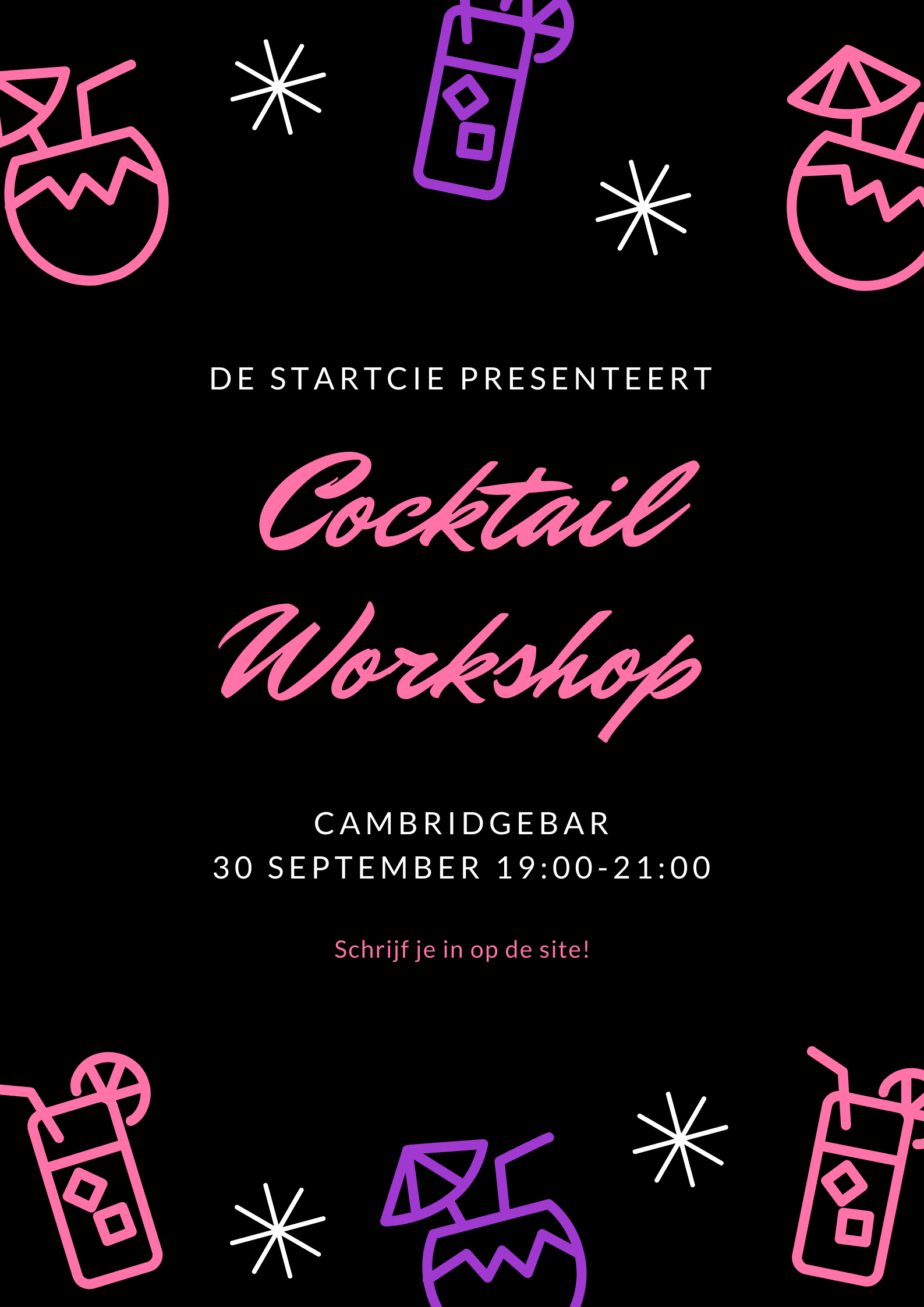 Ben jij bier beu? Ben je een exotische fijnproever die zijn/haar/hun hand niet omdraait voor nieuwe ervaringen? Kom naar onze cocktailworkshop! Leer (virgin) cocktails maken waar je nog nooit van hebt gehoord, maar je nooit meer zult vergeten... In twee uur gaan we vier cocktails maken én opdrinken in de Cambridgebar! Dit alles onder het genot van leuke spellen en heel veel gezelligheid. Achteraf kun je nog lekker blijven hangen om een biertje te drinken!