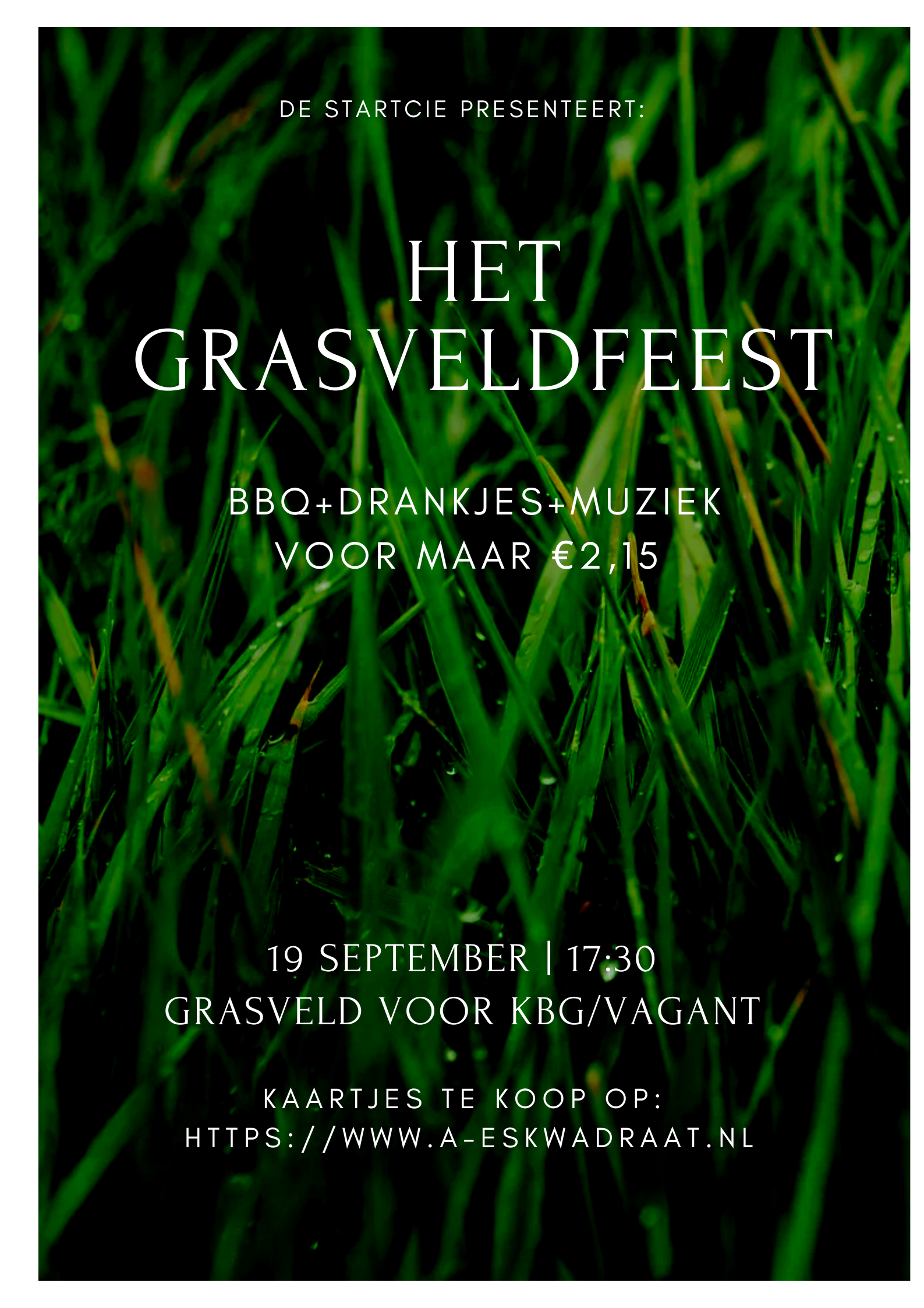 Are you done with studying already? Are you longing for the great atmosphere of the intro? That's possible! Next Thursday is the very first StartCie activity of the year: the grassfieldparty! For only €2.15 you can enjoy a (vegetarian) barbecue and drinks are also included. Register quickly via the website (link) because full=full. Hopefully we'll see you then!