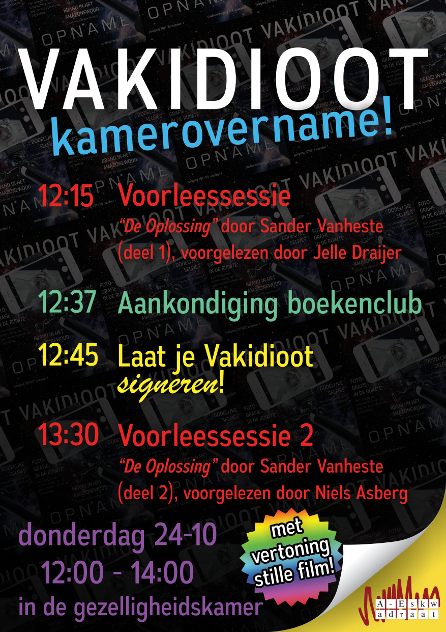 Come to the A-Es room and you'll be able to launch te newest edition of the Vakidioot with us. We'll even sign it for you. Sadly, it's in Dutch, and since you're reading the English version that could be a problem. But still.