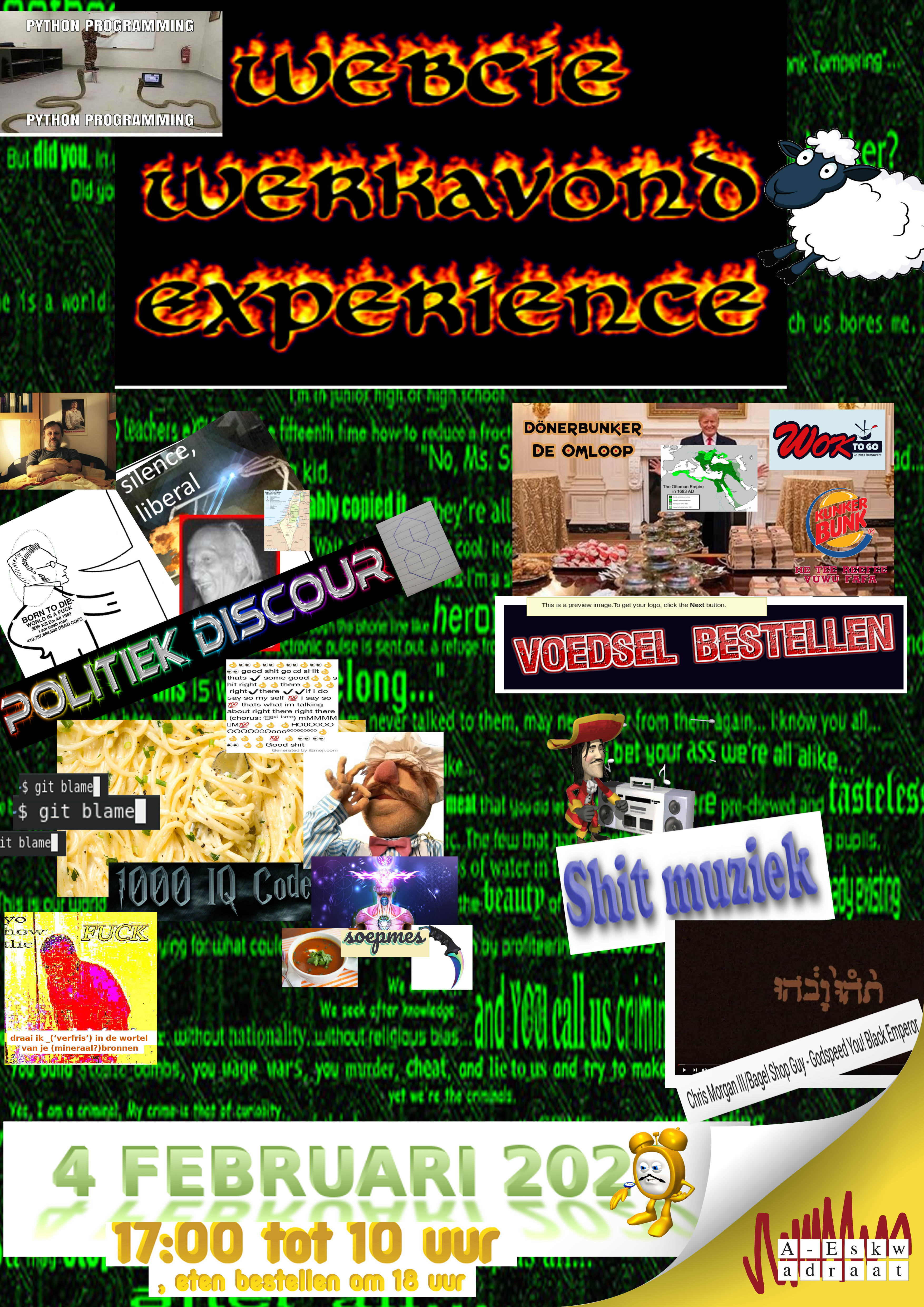 Do you want to know how this beautiful website is made? Do you want to know how much of a party a WebCie workevening is? Then come and take a look! From 17:00 there is a possibility to take a look at the WebCie workevening. Programming knowledge is not required en you're free to come and go between 17:00 and 22:00. Food will be ordered at 18:00, if you want to order with us without being there at 18:00 send us a mail at [email protected]