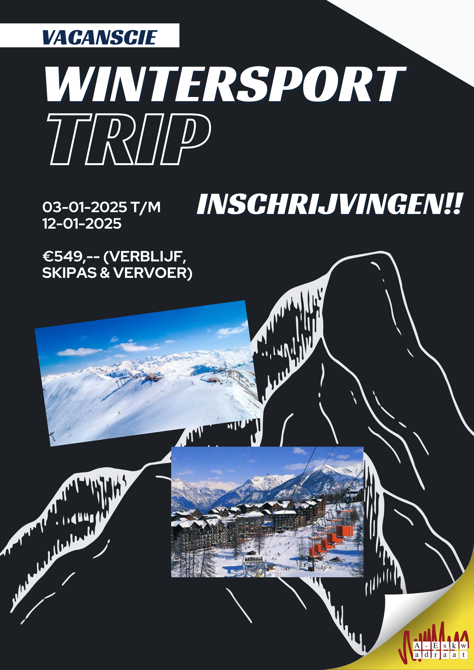 Skiperdiepiep, het is weer zover!!!! Natuurlijk gaat A-Eskwadraat ook dit jaar weer op wintersportreis. Ben jij ook zo moe van studeren? Wil jij lekker 100 km/u van die piste af? Of wil jij vooral lekker après skiën na een hele dag op die onhandig lange latten? Kom dan met de VacansCie op vakantie! De reis vind plaats van vrijdag 3 januari tot zondag 12 januari. De standaardkosten voor vervoer, verblijf en skipas zijn 549 euro. Op vrijdag 11 oktober, 17:00 openen wij de inschrijving. Er kunnen maar 40 mensen mee, dus op is op!