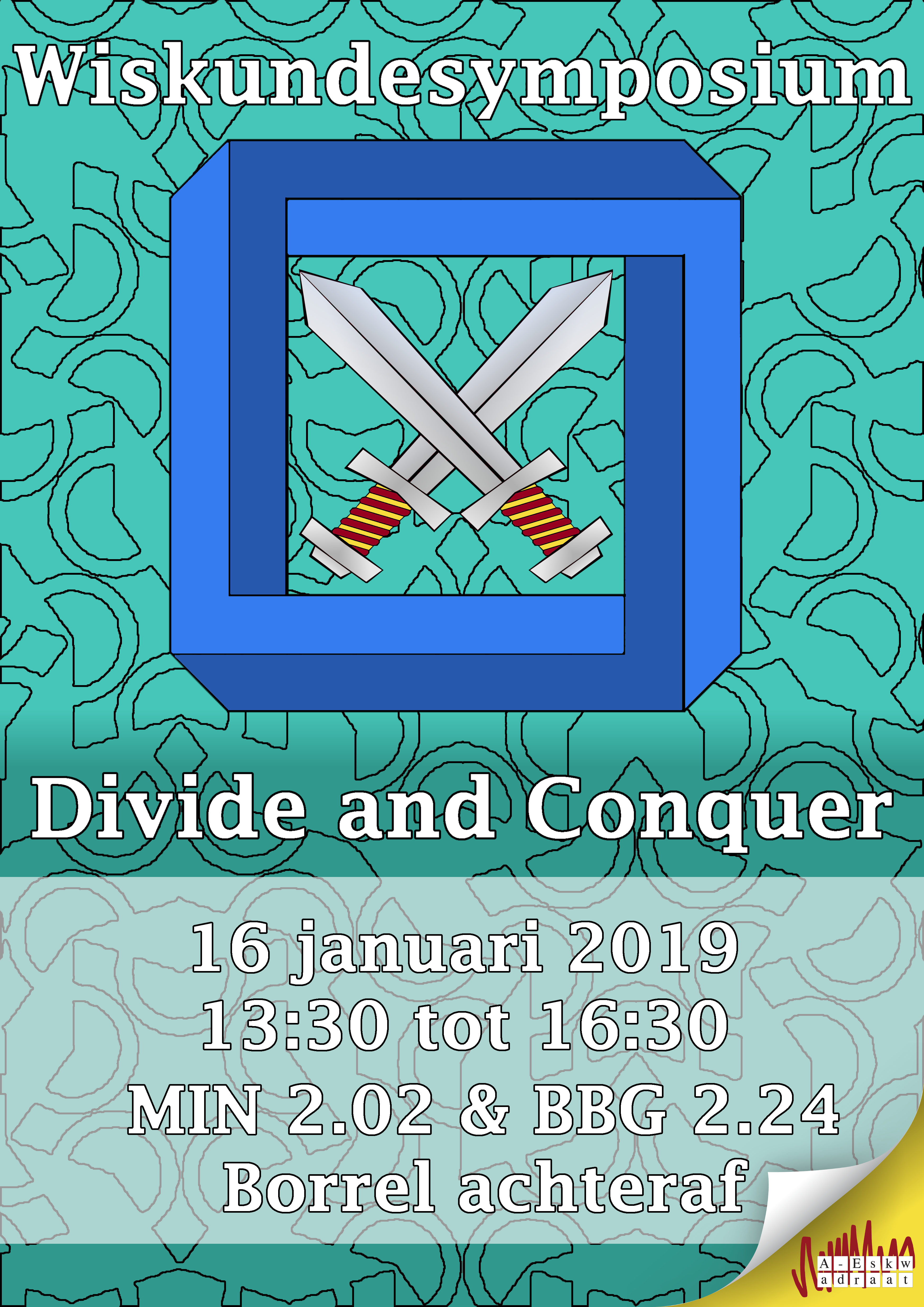 Het jaarlijkse wiskundesymposium komt er weer aan! Het thema van dit jaar is "Divide and Conquer". Het symposium zelf duurt tot 16.30 en daarna is er een borrel tot 18.30 voor alle aanwezigen.
